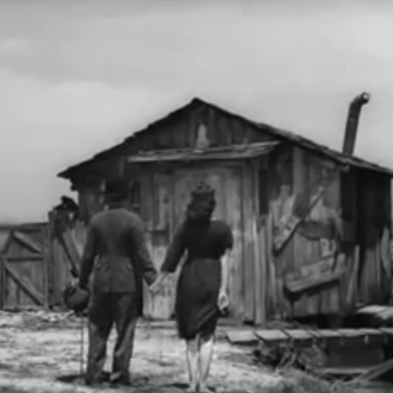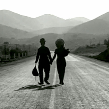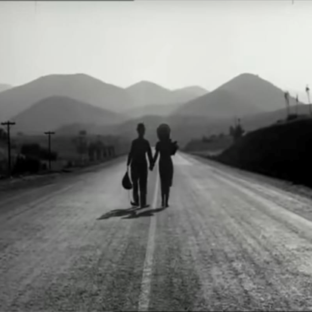 Este fotograma muestra a dos personas tomados de la mano en una carretera vacía, el hombre con ropa oscura y la mujer vestida de manera sencilla que parece acompañarlo en su camino, detallándolo desde un plano general porque resalta el paisaje y su entorno.