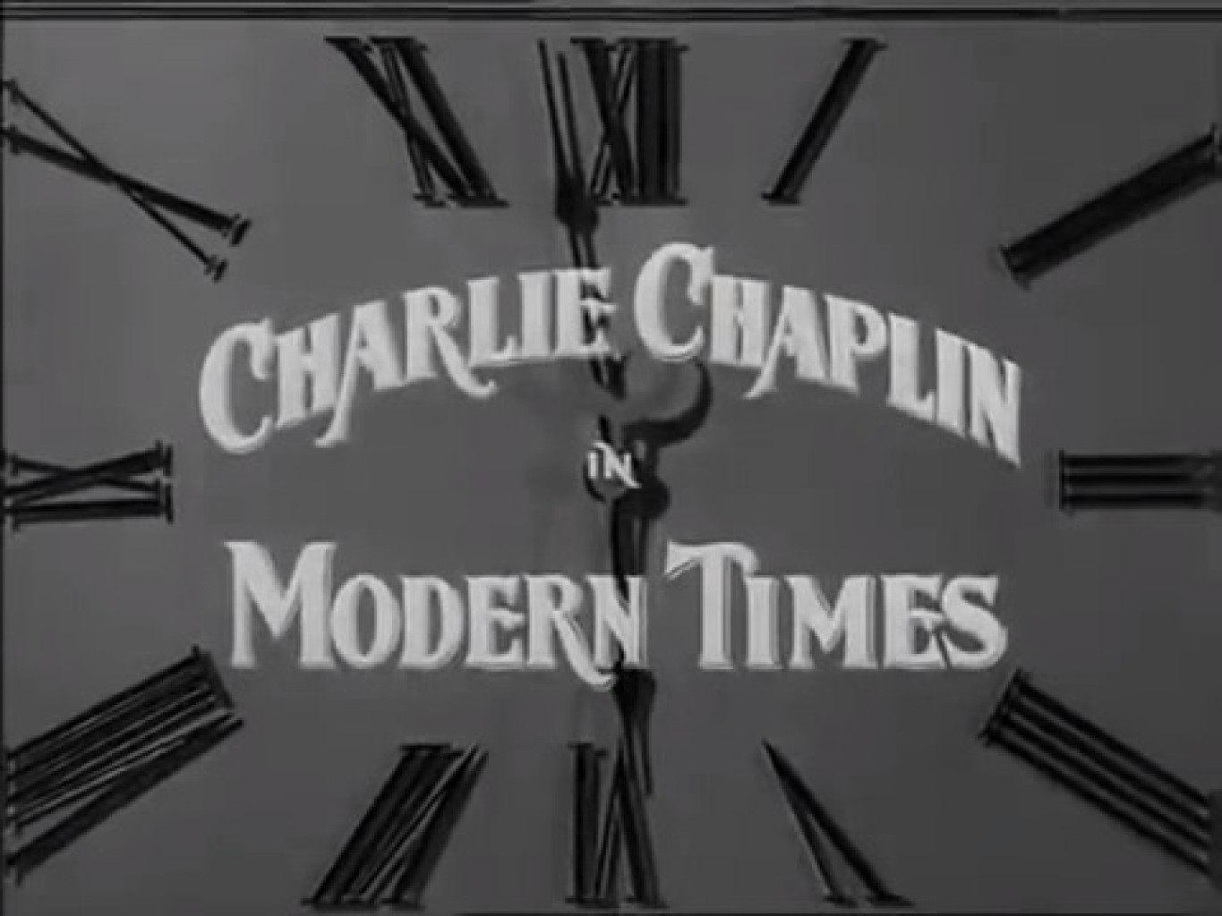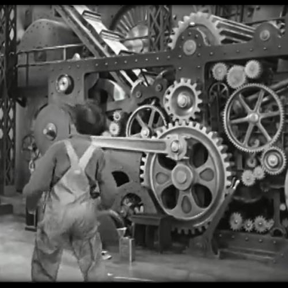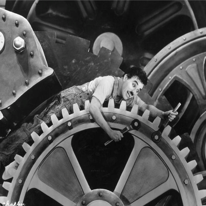 Se ve a Chaplin dentro de unos engranajes gigantes de una máquina industrial. Sus brazos y piernas están extendidos, como si fuera una parte más del mecanismo.
