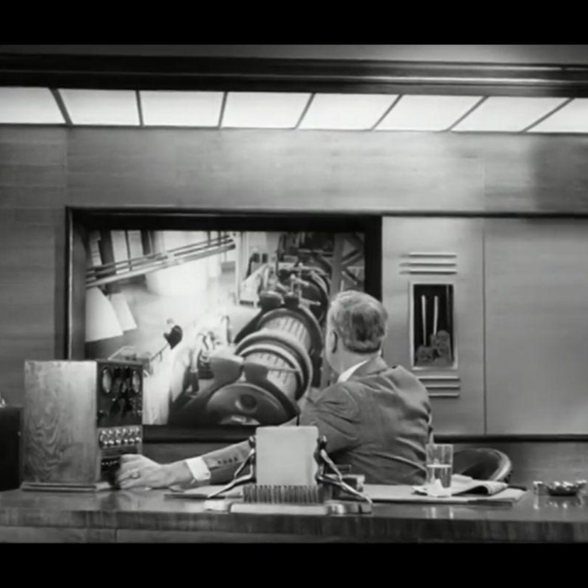 El blanco y negro resalta una época pasada. La presencia del teléfono y la pantalla subraya la importancia de la tecnología y la comunicación en ese tiempo. La concentración del hombre y el orden del escritorio sugieren un ambiente de trabajo y liderazgo. La escena parece ser de una película o programa antiguo.