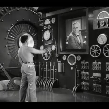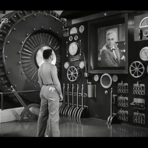 Un hombre de espaldas, torso desnudo, opera una máquina con una gran rueda, indicadores y palancas. En una pantalla aparece la figura de un hombre con traje. La imagen es en blanco y negro, estilo película antigua, con un plano medio y una iluminación suave que crea un ambiente de misterio y tensión.