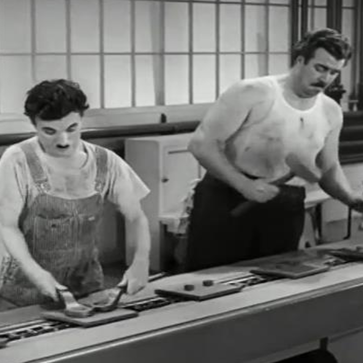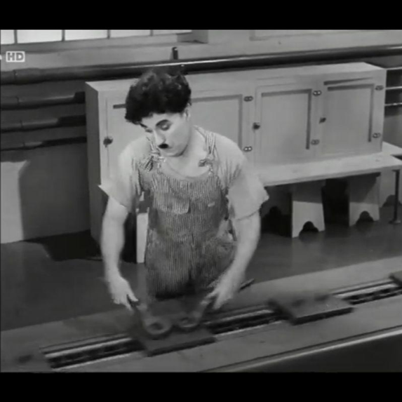 Chaplin trabaja en una línea de ensamblaje dentro de una fábrica, usando un overol rayado y camiseta manchada. Atornilla piezas rápidamente mientras otro obrero golpea con un martillo. El fondo industrial muestra ventanas grandes.