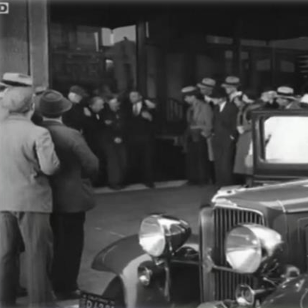 La imagen en blanco y negro muestra a un hombre con bigote siendo arrestado por dos policías y llevado hacia un carro policial. Otro hombre observa la escena desde dentro de un local mientras personas caminan y miran en la calle.