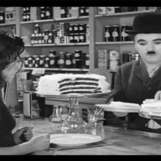 Chaplin está en un escenario, vestido de mesero, interpretando una canción con gestos exagerados. En su canto, usa palabras sin sentido.