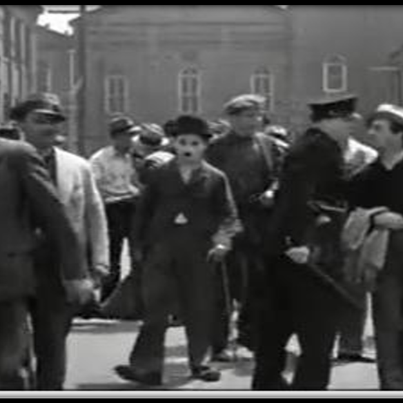 La imagen muestra a un grupo de obreros caminando por la calle con ropa desgastada. Chaplin está al centro con su atuendo característico. Hay policías interactuando con personas, lo que sugiere una protesta. Al fondo se ven edificios industriales, reflejando un entorno urbano obrero.