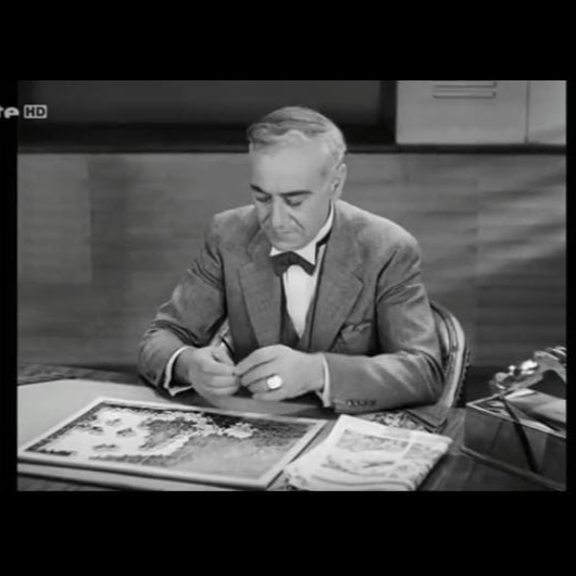 La imagen muestra a un hombre con cabello canoso, vestido elegantemente con traje y moño, concentrado armando un rompecabezas en su escritorio. Sobre la mesa hay un periódico y un teléfono. La imagen es en blanco y negro, estilo de película antigua, con un plano medio y luz suave que crea un ambiente tranquilo.