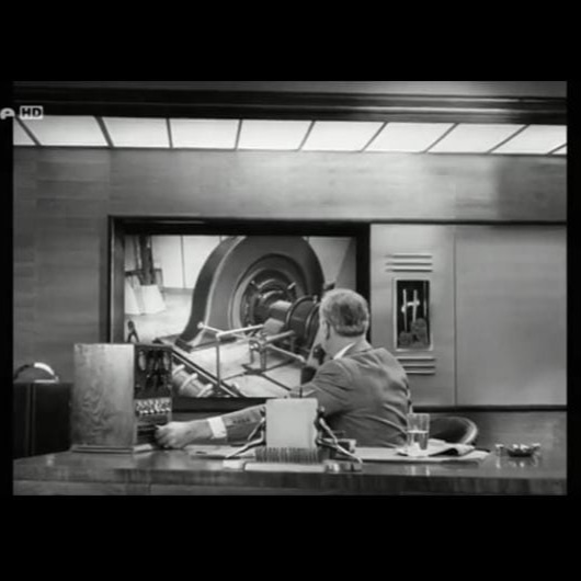 Esta escena representa la presión constante del sistema industrial sobre el trabajador la pantalla con el rostro del jefe funciona como símbolo de autoridad totalizadora, la presencia de relojes refuerza la idea del tiempo como tirano. Es una crítica directa al capitalismo industrial y a la pérdida de autonomía del individuo.